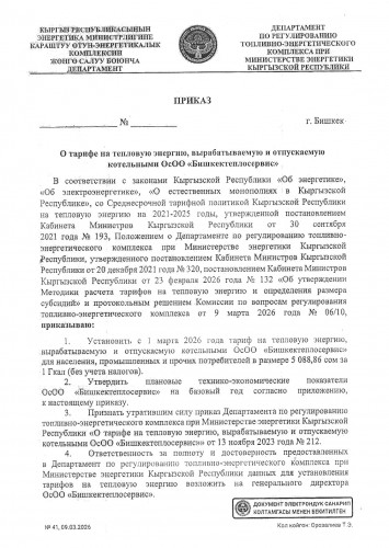 Приказ Департамента по регулированию топливно-энергетического комплекса "О тарифе ОсОО "Бишкектеплосервис""