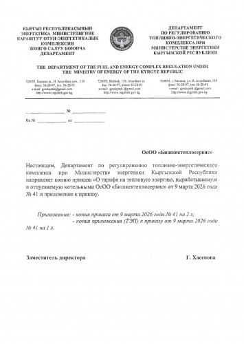 Приказ Департамента по регулированию топливно-энергетического комплекса "О тарифе ОсОО "Бишкектеплосервис""